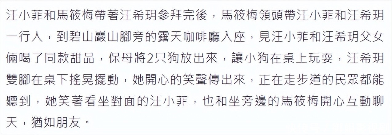 台媒指出女儿和马筱梅关系融洽,不时传来小朋友的笑声,连一旁的路人都可以听到,感觉到汪希玥真的很喜欢和汪小菲在一起。